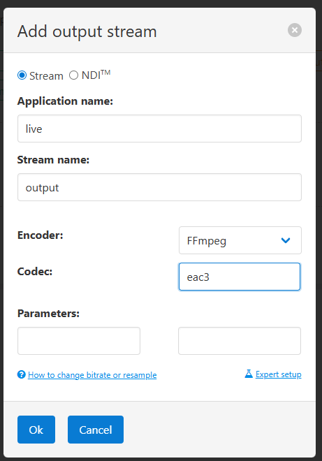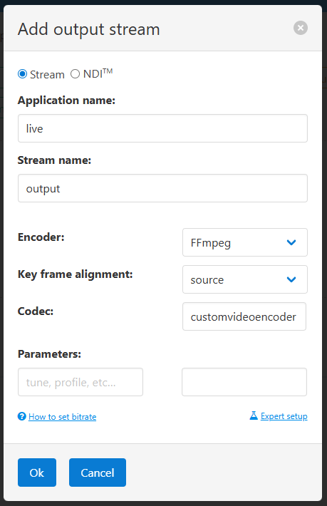 - In the “Add output stream” dialog, the “Encoder” dropdown menu must be set to “FFmpeg” value.