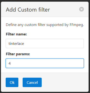 Custom filter is also easy to add. Here’s an example for interlacing filter which is added by tinterlace filter of FFmpeg: