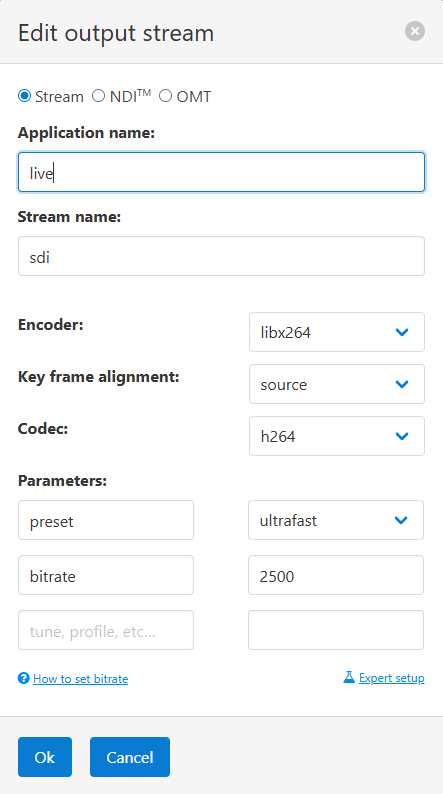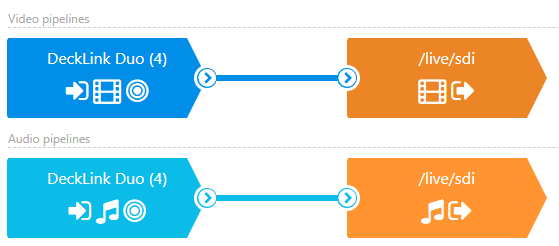 In order to use the received SDI content in streaming pipelines, the decoded stream needs to be encoded to appropriate format. In the scenario shown above, we have one encoder for video and one for audio, here are their settings for our example.